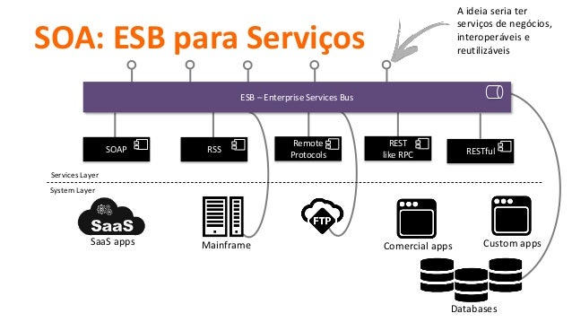 Portanto, você deveria focar em soluções de integração levemente acoplada ,e que te dá opções entre uma variedade de abordagens de arquiteturas e topologias que alcancem o centro do modelo mencionado de ESB e SOA.
