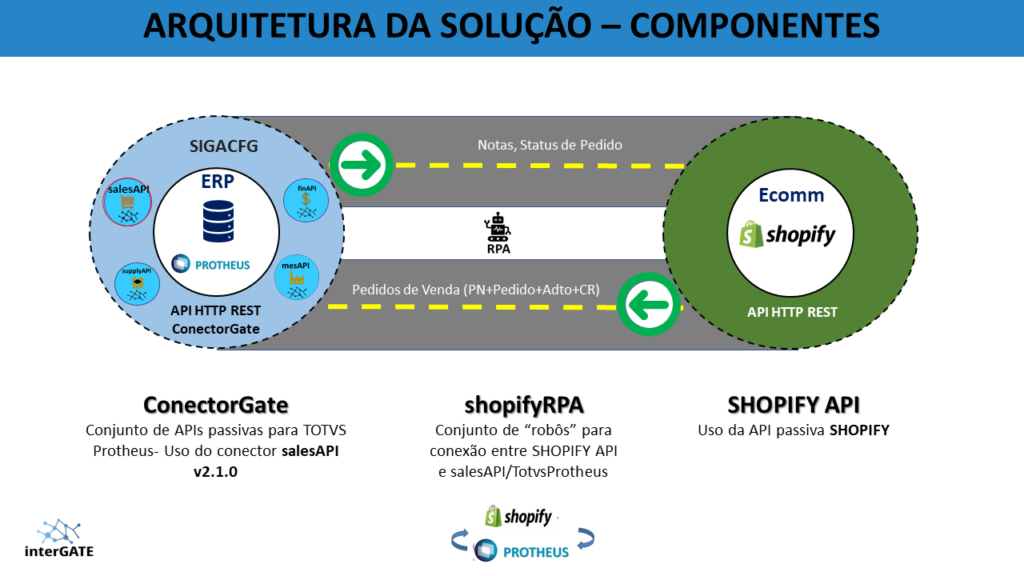 A Intergate apresenta o integrador shopifyRPA, um pacote de integração TOTVS Protheus, usado em conjunto com a API ConectorGate (salesAPI), para conectar o ERP Totvs Protheus com o eCommerce Shopify.